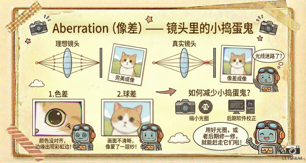 理想的镜头应该把所有光线完美汇聚成一个点,但现实中物理透镜无法做到 100% 完美,导致成像出现模糊、变形或色偏,这些偏差统称为“像差”。