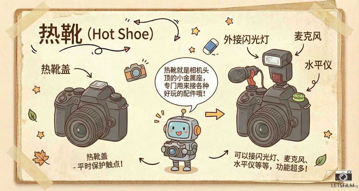 这是相机顶部的那个“金属卡槽”。直译过来是附件靴,其实指的是相机顶部的热靴插口,用来连接相机的一些外置附件,如外置闪光灯,外置麦克风的金属接口,带有电子触点以传输信号。