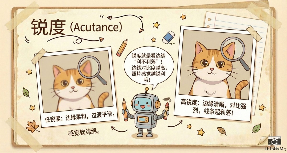 很多新手会把“锐度”和“分辨率”混淆,其实它们是两回事。锐度实际上是描述影像边缘明暗过渡的“干脆”程度。分辨率 (Resolution) 只有细节多(像素高),而锐度 (Acutance)则是轮廓清晰(边缘像刀切一样利落)。