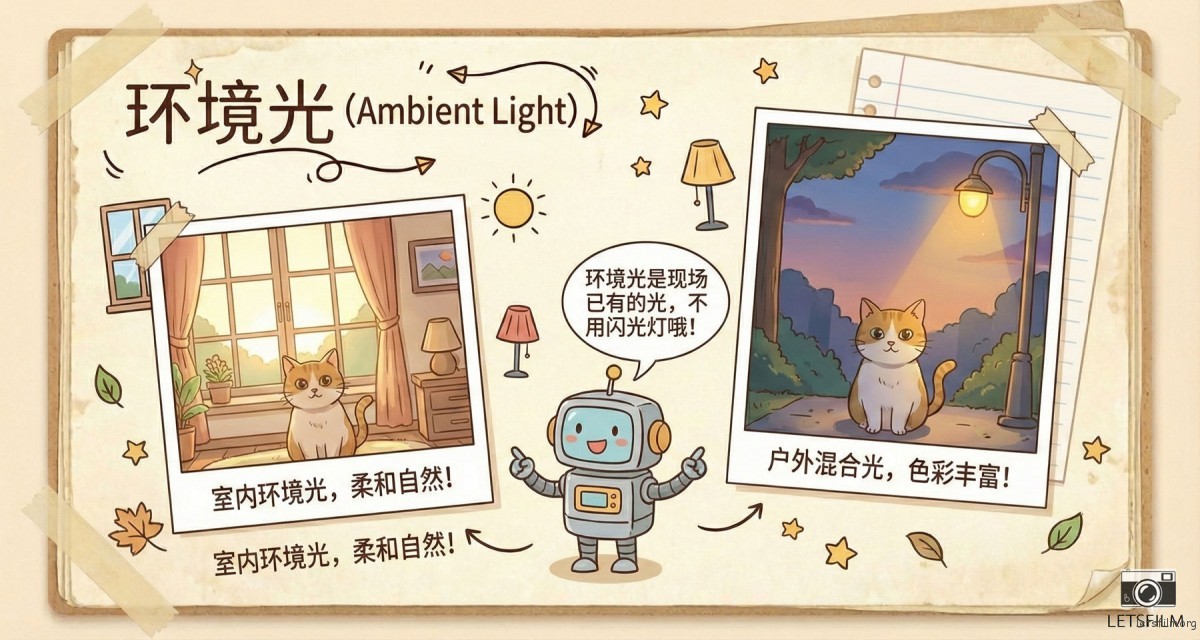 拍摄场景中自然存在的光源(如日光、室内灯光),非摄影师额外添加。