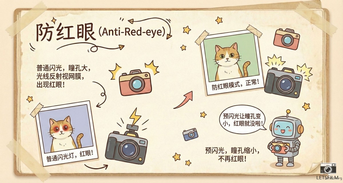 在正式拍摄(快门打开)之前,闪光灯会预先快速闪烁几次(预闪)。眼睛感受到预闪的强光,瞳孔会本能地缩小。等到瞳孔缩小时,相机才进行正式的强光闪烁并拍照。此时进入眼底的光变少了,红眼现象也就消失了。