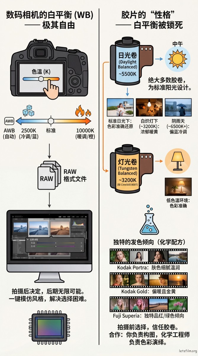 但在胶片世界里,这种自由被没收了。胶片是有“性格”的,它的白平衡在出厂的那一刻,就已经被化学家“锁死”在胶卷里了 。