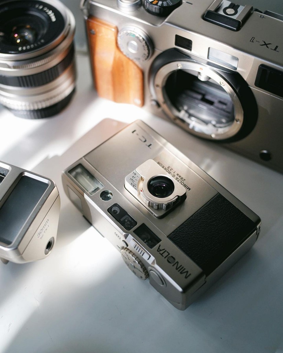 Minolta Prod 20's:这台 1990 年发布的相机可以被视为是 TC-1 的精神前身,Prod 20's 同样追求极致小巧的机身和高素质镜头,搭载了一枚 35mm f/4.5 镜头,限量生产,可以视为是美能达在高端袖珍领域的一次早期探索。
