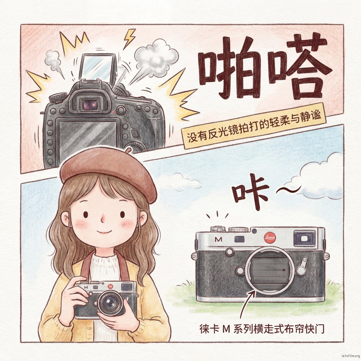经典的 Leica M3 于 1954 年问世,机身重量约 580 克,在那个年代的专业相机中算得上轻巧。它的布帘快门释放时发出的声音极为克制,不是单反那种"啪嗒"的声音,而是接近一声低沉的"咔"。这个声学特征是由物理结构决定的:没有了反光镜的拍打,震动源被从根本上消除了。
