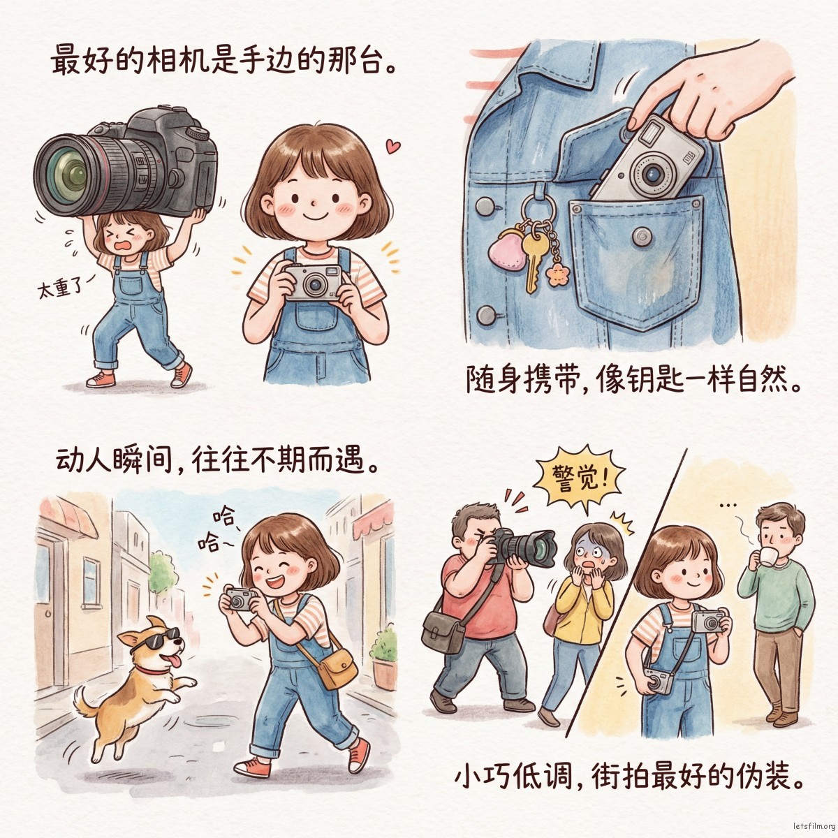 如果认真意味着必须背着五公斤的器材出门,花三分钟架好三脚架,再花两分钟用点测光表反复读数,那傻瓜机确实不够认真。但如果认真意味着每天都在观察,随时准备记录,在决定性瞬间到来的零点几秒内完成从口袋到按下快门的全部动作,那傻瓜机可能是世界上最认真的相机。