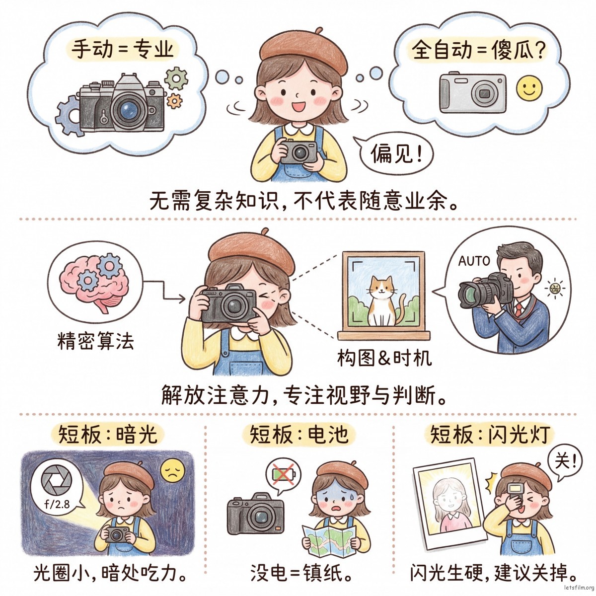 高端傻瓜机的自动化,是把复杂的曝光决策交给精密的算法,从而把摄影师的注意力解放出来,用更多的精力去决定构图和拍摄的时机。